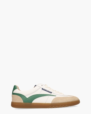 Deze herensneakers van Floris van Bommel, De Zaler 01.12/SFM-10224-50-01, zijn vervaardigd van hoogwaardig wit leer en beige suède afgewerkt met opvallende groene lederen belijning opzij en op de hielcap. De sneaker is voorzien van een lichtgewicht cupzool met een opvallend gummy zigzag-patroon aan de zijkant, wat zorgt voor de herkenbare FVB-stijl. De voering van de schoen is gemaakt van leer en het voetbed is uitneembaar. Branding vind je op de off-white mesh tong, aan de zijkant en op de hielcap. Gebroken witte katoenen veters, gekartelde afwerking en perforaties maken de vintage-look indoor sports sneakers compleet. Kleur: wit/multi. (Green) Schoenen van Floris Van Bommel hebben over het algemeen een iets ruimere pasvorm.