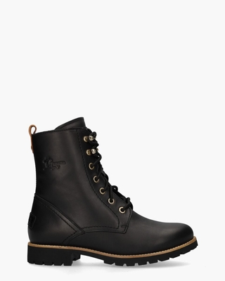 Veterboots voor dames Fara Igloo Travelling B1 van het Spaanse merk Panama Jack. Dit model is gemaakt van zwart nappaleer. Aan de binnenkant zijn de booties in warm schapenvacht met een uitneembaar voetbed uitgevoerd. De duurzame rubberen TPU-zool met hak van ongeveer 3 cm hoogte is flexibel, sterk en slipvrij. De schacht heeft een hoogte van 20 cm en sluit aan de zijkant met een rits. Bruine lederen sierlus, gouden veterhaakje en eyelets, branding op de tong en op de hiel en zwarte veters maken de stoere stijl compleet. Kleur: zwart. (Negro)