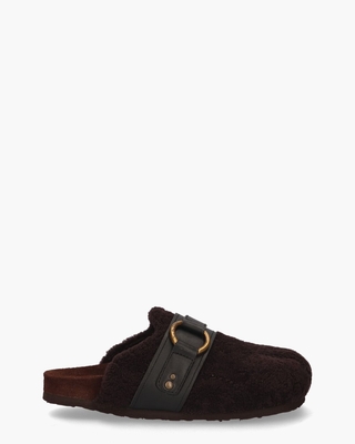Slippers of pantoffels voor dames Gema van het merk See By Chloé. Deze comfortabele slides hebben een upper van donkerbruine faux lammyvacht afgewerkt met een zwarte leren band met gouden logo-gesp. Zowel de voering als het voorgevormde voetbed zijn in suède en leer uitgevoerd. De kartelzool is van rubber gemaakt. Kleur: donkerbruin.