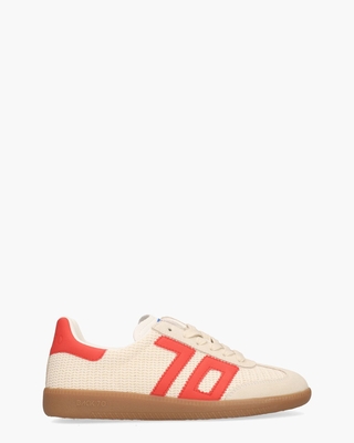 Sneakers oldskool stijl voor dames Ghost 02 uit de collectie van het sneakerlabel Back 70. Het bovenwerk is gemaakt van gebroken witte geweven stof en suède. Het kunstleren hielstuk en het bijpassende gekartelde 70-logo in een opvallende rode tint zorgen voor een opvallend contrast. Binnenin zorgt de stoffen voering met uitneembaar voetbed voor een prettig draagcomfort. Branding op de tong, zijkant en zool geeft deze sneaker een herkenbare Back 70-signatuur. De look wordt afgerond met een vintage gummy zool en gebroken witte katoenen veters. Kleur: off-white/rood. (Red)