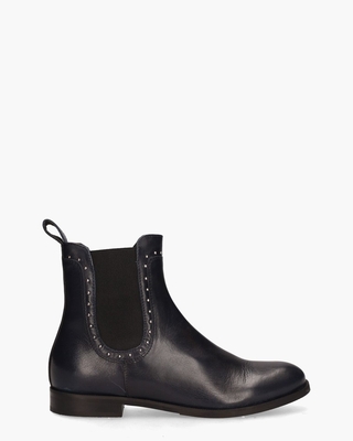 Chelseaboots voor dames  Giulietta uit de collectie van Maripé. Deze donkerblauwe booties heben een lederen buitenzijde en zijn leergevoerd. Rond de elastische Chelseabewerking zijn zilveren mini-studs aangebracht. De schacht is ongeveer 14, 5 cm hoog. De laarsjes sluiten met een rits opzij. Op het lage hakje van 2, 5 cm loop je comfortabel. Leren sierlusjes maken de boots compleet. Kleur: donkerblauw. (Blu Scuro)