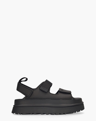 De Goldenglow Sandal 1152685 damessandaal van UGG is licht, stoer en helemaal van nu. Dit platformmodel is gemaakt van gerecycled EVA in een all-over zwarte tint. De brede straps met klittenbandsluiting passen zich moeiteloos aan je voet aan. Het geribbelde voetbed en de stevige rubberen zool van circa 4, 5 cm bieden comfort én grip, zelfs op warmere dagen. Ton-sur-ton details en subtiele UGG-logo’s zorgen voor een strakke, moderne look. Kleur: zwart. (Black)