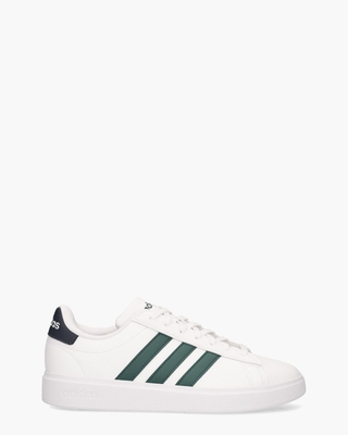 Witte low-top sneakers voor heren Grand Court ID4465 uit de Adidas Originals collectie. Deze cleane sneaks hebben een bovenwerk van kunstleer deels gemaakt van rest- en productieafval. De binnenzijde, met uitneembaar voetbed, is in stof uitgevoerd. Bovendien loop je op de speciale Cloudfoam middenzool supercomfortabel. De kenmerkende groene 3-stripes en donkerblauwe hielcap maken de sneakers cool en classic. Branding is zichtbaar op de tong, het hielstuk en op de zool. Witte katoenen veters en een witte rubberen zool maken de retro-style sport shoes compleet. Kleur: wit/groen/donkerblauw. (Cloud White/Collegiate Green/Shadow Navy)