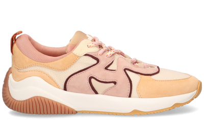 Sneakers voor dames HXW5970EA90R7K0MRZ uit de H597-serie van het luxury label Hogan. Deze futuristische bold sneaks in runner-style hebben een upper in een materiaalmix van suède, stof en mesh in verschillende tinten zoals ecru, roze, oranje en bordeauxrood. De binnenkant is in leer en stof uitgevoerd en voorzien van een Memory Foam uitneembaar voetbed. Op de tong, aan de zijkant en achterop de zool is een brandlogo zichtbaar. De bijzondere driekleurige bulky rubberen zool meet circa 4, 5 cm. Matching driekleurige veters en oranje stoffen lusjes maken de shoes compleet. Kleur: multi. (Beige/violet/ Ivory)