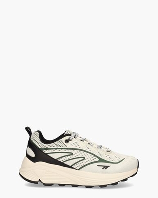 Sneakers voor dames HTS RGS Fizo van het sportslabel HI-TEC. Dit re-design van het origineel uit 2013 heeft een bovenzijde van off-white gebreid meshmateriaal afgewerkt met imitatieleer in zwart, groen en gebroken wit. De luchtige mesh voering is voorzien van een uitneembaar voetbed. De sneaker heeft een innovatieve tussenzool en chunky Vibram buitenzool die de natuurlijke beweging van de voet ondersteunt. Branding is zichtbaar op de tong en de zool. Zwarte/off-white veters maken de supersnelle sneaks compleet. Kleur: off-white/zwart/groen. (Cotton/ Dark Ivy)
