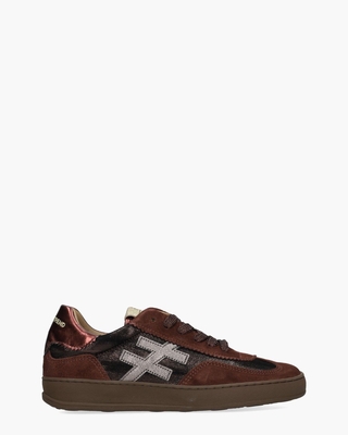 Deze Iconic II sneaker voor dames van Another Trend is een echte blikvanger. Het donkerbruin suède en velvet materiaal creëert diepte, terwijl het opvallende metallic oranje logo op de zijkant, de goudkleurige hiel en de matching afwerking op de tong de schoenen een luxe uitstraling geven. De metallic donkerbruine veters en gekartelde afwerking voegen een speelse twist toe. Dankzij de retro rubberzool geniet je van een stevige basis en de synthetische voering met uitneembaar microfiber voetbed maakt ze extra comfortabel. Merklogo's op de tong en hielcap maken de toffe look helemaal af. Draag ze met een oversized blazer over een hoodie en straight jeans voor een moderne streetstyle. Kleur: donkerbruin. (Dark Brown) ...