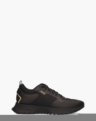 Deze zwarte sneaker van BOSS Jonah wordt gekenmerkt door zijn eigentijdse design en een materiaalmix van synthetische stof, mesh en rubber. De binnenvoering van de runner is van textiel gemaakt en beschikt over een uitneembaar voetbed. De sportieve zwarte rubberen zool heeft een grof profiel en is voorzien van het BOSS-logo. Gouden accenten en branding in goud opzij maken de sport shoes af. Kleur: zwart. (Black)