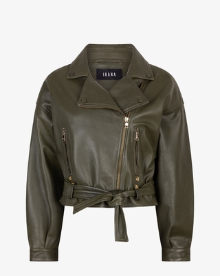 Dit Ibana damesjack Jonet met wijde fit en openstaande kraag is gemaakt van hoogwaardig, soepel leer dat luxe aanvoelt en prachtig valt. De volledig gevoerde binnenkant, de strikband en twee zijzakken met goudkleurige ritsen versterken het verfijnde karakter. Door de non-stretch kwaliteit behoudt het jasje altijd zijn elegante, vrouwelijke silhouet. Kleur: olijfgroen. (Olive Night) Onderhoud: • Alleen door gespecialiseerde stomerij laten reinigen.