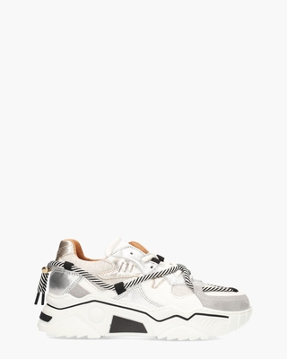 Jupiter Metallic damessneakers van DWRS Label. Deze stoere sneakers met bulky zool zijn gemaakt van verschillende materialen, waaronder leer, suède en stof. Naast dat de sneaker uit verschillende materialen bestaat, worden er ook verschillende kleuren en afwerkingen gebruikt, zoals metallic goud en zilver. Juist deze afwisseling in kleuren en materialen zorgt voor een toffe look. De sneakers hebben een upper van verschillende tinten wit en grijs in combinatie met metallic details. De binnenkant is volledig in leer uitgevoerd en het voetbed is uitneembaar. Toffe details zijn de zwarte/witte sierveter en DWRS logo op de hiel. De grove witte zool met zwarte accenten maakt deze sneakers helemaal af. Kleur: wit/multi. (Silver/Grey)