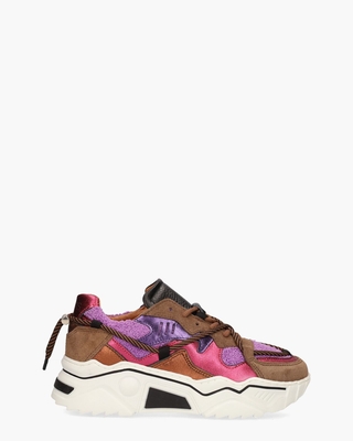 Sneakers voor dames Jupiter Terry uit de collectie van het Nederlandse merk DWARS label. Dit model heeft een upper van bruin suède en multicolor deels metallic leer en paars badstof. De binnenkant is ook in leer uitgevoerd en de schoenen hebben een lederen uitneembaar voetbed. Zwarte stoffen lusjes houden de veters op hun plek. De bulky rubberen zool in wit en zwart zorgt voor comfort. Gestreept bruin/zwart aantrekkoord, bruine ronde veters en zilverkleurige hardware maken de sneakers compleet. Kleur: bruin/multi. (Purple/Brown)