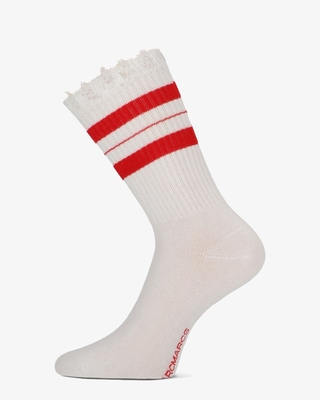 Geef je outfit een sportieve flair met de Kate 82183-1058 damessokken van Marcmarcs. Deze witte sokken zijn uitgevoerd met een geribbeld design en rode strepen en zijn samengesteld uit 78% katoen, 20% polyamide en 2% elastaan. De rafelige bovenrand zorgt voor een vintage uitstraling. Kleur: wit/rood. (White/ Red) (S = 35-38) (M = 39-42) Onderhoud: • Binnenstebuiten wassen met soortgelijke kleuren op 30 graden. • Niet in de droogtrommel drogen. • Niet strijken.