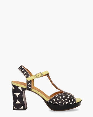 Deze Keduni sandalen voor dames van het merk Chie Mihara, stralen stijl uit met een bovenzijde van zwart/wit geprint leer en lichtgeel leder, afgewerkt met een metallic bronzen leren bies. Het binnenwerk en voetbed zijn gemaakt van zacht leer. Pas de bandjes naar wens aan met het zilverkleurige gespje bij de enkel. De blokhak heeft een hoogte van ongeveer 9 cm. De bijpassende zwarte platformzool aan de voorzijde meet 1, 5 cm in hoogte. De onderzool is vervaardigd in een combinatie van leer en rubber. Kleur: zwart/wit/multi.