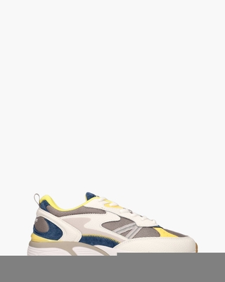 Sneakers voor heren Kentucky uit de collectie van het sneakerlabel HOFF. Dit model heeft een bovenzijde van suède, mesh en stof in wit, blauw, geel en grijs. De binnenkant is in badstof uitgevoerd en is voorzien van een memory foam uitneembaar voetbed. Branding is zichtbaar op de tong en de achterkant. De driekleurige rubberen 3, 5 cm hoge zool heeft profiel voor een goede grip. Een gele kunststof stabilizer en witte veters maken de toffe sneaks compleet. Kleur: multi.