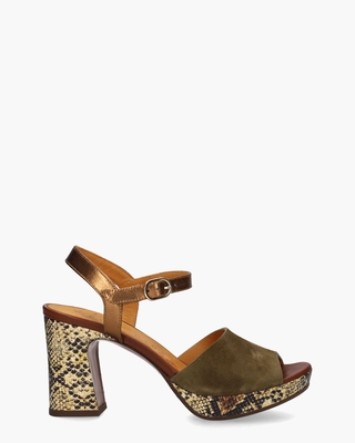 Kerick sandalen met blokhak van het merk Chie Mihara. Deze prachtige sandalen met groen suède, brons en slangenprint zijn stoer en vrouwelijk tegelijk. De sandalen hebben een brede groene band van suède over de wreef en bronskleurige bandjes rond de enkel die sluiten met een klein gespje. De blokhak van 9 cm en de plateauzool van circa 1.5 cm zijn voorzien van een slangenprint. Door de brede hak en platform zijn ze erg comfortabel. Het binnenwerk en voetbed zijn vervaardigd uit zacht leer. De onderzool bestaat uit een combinatie van leer en rubber. Kleur: groen/bruin.