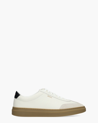 Met deze BOSS Kieran herensneakers kies je voor minimalistisch design met een luxueuze afwerking. Het witte gestructureerd leren bovenwerk wordt aangevuld met lichtbeige suède details op de neus waardoor het model extra diepte krijgt. De stoffen voering en het uitneembare voetbed zorgen voor optimaal draagcomfort, terwijl de stevige rubberen zool de sneaker een retro karakter geeft. De zwarte hielcap met geborduurde accenten en het goudkleurige BOSS-logo opzij maken het ontwerp compleet. Witte veters en branding in reliëf op de tong maken de sneakers af. Perfect te dragen met een donkerblauwe jeans en een bomberjack voor een sportieve look. Kleur: wit. (Open White)