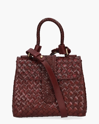De handgemaakte Kirsten Mini Dama van Allan K combineert traditioneel vlechtwerk met een eigentijdse uitstraling. Het bordeauxrode leer, de subtiele glans en de gouden hardware geven de tas een luxe karakter. De binnenkant is gevoerd met katoen en biedt ruimte dankzij het ruime hoofdvak en twee steekvakken. De drie magneetsluitingen houden je spullen veilig opgeborgen, terwijl het gevlochten handvat en de afneembare, verstelbare riem veelzijdigheid bieden in styling. Afmetingen: hoogte 18 cm, breedte 20 cm, diepte 10 cm. Kleur: bordeauxrood. (Burgundy)