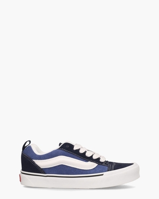Deze damessneakers, model Knu Skool VN0009QCNWD, uit de collectie van Vans hebben een bovenwerk van suède in donker- en felblauw met een stoffen voering. De schoenen zijn voorzien van een extra dikke tong en enkelkraag voor een authentieke 90's look. De padded enkelkraag en tong bieden daarnaast extra ondersteuning. De witte rubberen cupzool is afgewerkt met een donkerblauwe streep. De witte Vans side-stripes zijn in een opvallend '3D'-ontwerp uitgevoerd. Perforaties aan de zijkant, een rood Vans-logo op de achterkant, witte katoenen veters en een stoffen blauwe hiellus maken de schoenen compleet. Kleur: blauw. (Navy/True White)