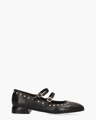 Ballerina's voor dames model L79105 van het merk MJUS. Deze stijlvolle schoenen op een carréleest hebben een zwart leren upper met een subtiele structuur. De gouden studs rondom en de fijne riempjes met goudkleurige gespjes over de wreef geven de ballerina's extra cachet. De binnenkant is ook volledig van leer gemaakt en heeft een vast voetbed. Het comfortabele hakje is ongeveer 3 cm hoog. Kleur: zwart. (Nero)