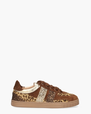 Sneakers voor dames Leda Glam D936122 uit de collectie van het Italiaanse merk AGL - Attilio Giusti Leombruni. Dit model heeft een upper van cognackleurig kalfssuède en zacht ponyhair in een luipaardprint. De binnenkant is ook in zacht leer met een uitneembaar lederen gel voetbed uitgevoerd. Opvallend zijn de kalfslederen gouden accenten en bronzen glitterdetails. Ook de cognac stoffen bredere veters zijn cool. Op de lichtbruine rubberen 2 cm hoge cupzool met AGL-logo loop je comfortabel. Goudkleurige veteroogjes, gouden logotong en gekartelde afwerking maken de sneakers compleet. Kleur: cognac/goud.
