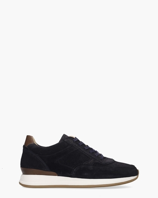 Sneakers voor heren model Libra 05.04/SBM-10020-41-01 van het merk Van Bommel. Het bovenwerk van donkerblauw suède wordt stijlvol aangevuld met een donkerbruine leren hielcap. De witte runningzool met een bruine onderzool biedt optimale stabiliteit en grip. Binnenin zorgt de luxe kalfsleren voering voor hoog draagcomfort, terwijl het uitneembare voetbed extra gemak biedt. Subtiele branding op de tong en zool, een donkerbruine kunststof stabilizer en donkerblauwe katoenen veters maken het design compleet. Deze schoen is gemaakt op een comfortabele leest met een G1/2 wijdte.  Kleur: donkerblauw. (Dark Blue) Schoenen van het merk Van Bommel vallen over het algemeen ruimer uit.
