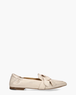 Deze VIA VAI Lola Rayne 62040-04-1219 damesloafers in off-white leer met een gouden print stralen pure klasse uit. Het zachte lederen bovenwerk en de spitse neus geven deze instappers een stijlvolle look. Het strikdetail op de wreef voegt een elegante touch toe. Dankzij het elastische hielstuk en het zachte foam voetbed bieden deze loafers niet alleen een chique uitstraling, maar ook ultiem draagcomfort. Het lage hakje van ongeveer 1 cm maakt het ontwerp compleet en zorgt voor een subtiele lift. Kleur: off-white/goud. (Beige Metallic)