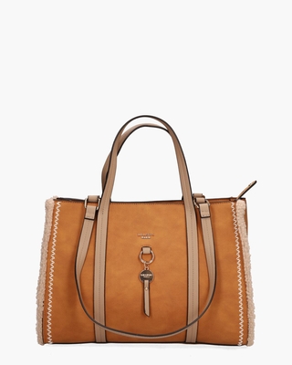 Shopper Manduria Tote Bag S247691 van het Franse merk Lollipops. De tas biedt diverse draagmogelijkheden dankzij de twee verschillende lengtes van de handvatten. De buitenkant van de tas is gemaakt van rubber met stiksels en is afgewerkt met zachte boucléwol, wat zorgt voor een opvallende uitstraling. Het gouden logo op de voorkant en de metalen bedel met ritstrekker voegen een speelse touch toe aan dit model. Binnenin de bag vind je een ruim stoffen interieur met een groot vak en twee handige steekvakjes, ideaal om je spullen georganiseerd te houden. Voor snelle toegang tot essentiële items is er een extra ritsvak aan de buitenkant. Afmetingen: hoogte 28 cm, breedte 38 cm, diepte 15 cm. Kleur: bruin/cognac. (Beige)