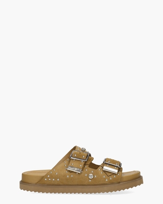 Deze dames Marta slippers van Toral hebben een bovenwerk van zacht suède in een bruine tint. Dit model is versierd met zilverkleurige studs en 'kristalletjes' wat zorgt voor een luxe look. Het voorgevormde leren voetbed zorgt voor extra comfort bij elke stap. De twee verstelbare wreefbanden met zilveren gespen bieden een perfecte pasvorm. De rubberen zool is voorzien van kartels voor goede grip. Kleur: bruin. (Camel)