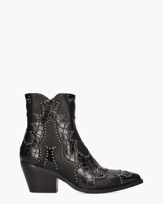 De Western enkelboots Miranda voor dames van Noa Harmon zijn een opvallende keuze met een spitse leest en een zwart gestructureerd lederen bovenwerk. De boots zijn voorzien van zwarte applicaties in leer met een krokodillenprint en lakleer. Kleine zilveren studs voegen een extra glamoureus accent toe. Binnenin zijn de laarsjes uitgevoerd met een stoffen voering en een vast lederen voetbed voor comfort. De schuine hak van 6, 5 cm geeft ze een elegante lift, en de ritssluiting aan de zijkant maakt het aantrekken eenvoudig. De schacht is ongeveer 14 cm hoog. Kleur: zwart. (Black) Maak jouw stijl compleet met de bijpassende Noa Harmon Vitto () tas.