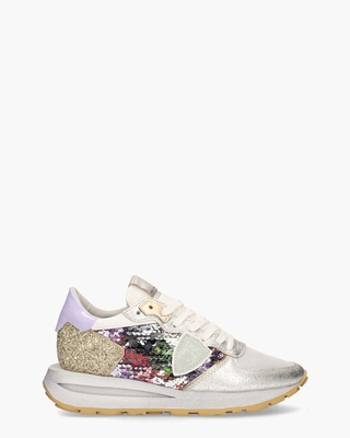 Damessneakers Tropez Haute TKLD PG01 van het Franse sneakerlabel Philippe Model. Deze sneakers zijn vervaardigd van wit en zilver leer en meshmateriaal. Gouden glitters en een multicolor paillettenbewerking voegen real glamour toe aan de schoenen. Het logo is zichtbaar op de lila lakleren hielcap en op het zilveren embleem op de tong. De binnenkant is gevoerd met leer en comfortabel badstof, met een uitneembaar voetbed voor extra gemak. De kenmerkende suède patch vind je aan de zijkant van de sneakers. De zilveren/bruine rubberen zool is 3 cm hoog en heeft een grof profiel voor grip en stabiliteit. Witte katoenen veters geven de "made with care in Italy" trainers een unieke uitstraling. Kleur: wit/multi.