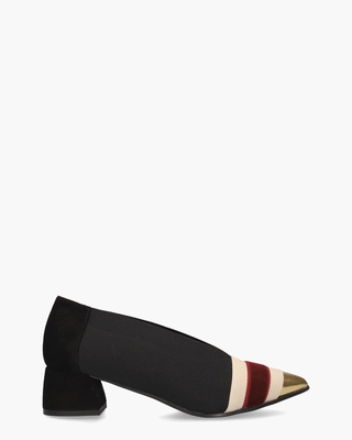Pumps voor dames model Mollie van Daniele Ancarani. Deze verfijnde pumps zijn gemaakt in een combinatie van zwart suède en elastisch materiaal. Het spitse neusje is bewerkt met gebroken witte stretchstof, rood velours en goudkleurig leer. De binnenkant, inclusief het voetbed, is volledig bekleed met leer, wat zorgt voor een luxe draagervaring. De zwarte suède blokhak van circa 4, 5 cm biedt niet alleen een elegante uitstraling, maar dankzij de rubberen inzet ook extra grip en stabiliteit. Ideaal voor wie op zoek is naar een stijlvolle en comfortabele pump. Kleur: zwart/multi.