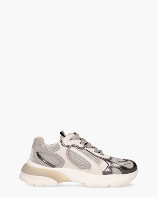 Sneakers voor dames Muriel uit de collectie van B.L.A.H. Dit model heeft een bovenwerk van leder, suède en gerecycled mesh in wit en lichtgrijs. De binnenzijde is ook in leer met een uitneembaar voetbed uitgevoerd. De sneakers zijn afgewerkt met metallic zilvergrijs leer. Op de bulky zool in wit en beige gerecycled rubber loop je comfortabel. Grijze katoenen veters en branding op de neus en de tong maken de sporty shoes af. Kleur: wit/grijs.