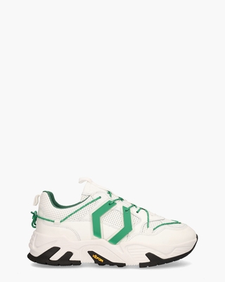 Sneakers voor heren New Boom uit de collectie van het Spaanse merk Mikakus. Geà nspireerd op sneakermodellen uit de jaren 70 hebben deze sneakers een upper van wit geperforeerd leer. De binnenkant is gemaakt van 100% gerecycled materiaal en is voorzien van een uitneembaar voetbed. Opvallend is de rubberen groene/transparante bewerking aan de zijkant en ook het vetersysteem springt meteen in het oog. Witte linnen strips maken de shoes af. Op de witte/zwarte rubberen Vibramzool loop je tot slot comfortabel. Kleur: wit/groen. (White/Grass)