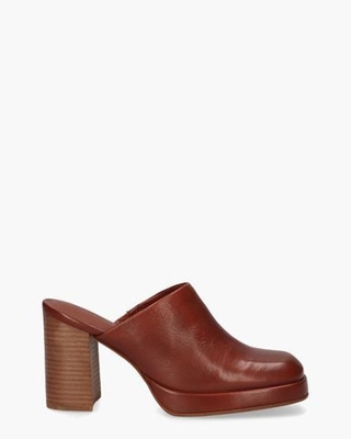 Muiltjes voor dames New-Melanie 75125-J-27 uit de collectie van Bronx. Dit model heeft een upper van cognackleurig licht gestructureerd leer. De voering is ook van leer gemaakt. De houten blokhak heeft een hoogte van circa 9 cm en het plateau bij de voorvoet meet 2 cm. De slides hebben een carréleest en een rubberen onderzool. Kleur: cognac. (Caramel)