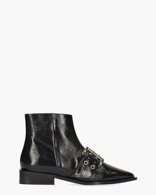 De Toral Nicole enkelboots voor dames hebben een elegant zwart gestructureerd lakleren bovenwerk. De band met een zilveren gesp over de wreef zorgt voor een fashionable look. De binnenkant is uitgevoerd in leer met een vast voetbed. Met hun puntige neus en vierkante afwerking in de rubberen zool stralen deze enkellaarsje subtiele verfijning uit. Het lage hakje van circa 3 cm voegt net dat beetje extra aan de look toe. Perfect te combineren met een jeans, shirt en blazer. Kleur: zwart. (Negro) Gebruik voor laklederen schoenen of tassen altijd een  Lack Polish (https://www.vanarendonk.nl/collonil-lack-polish/) of  Lack Mousse (https://www.vanarendonk.nl/collonil-lack-mousse/) om het leer soepel te houden en zet lakschoenen in schoenspanners (https://www.vanarendonk.nl/nico-5212-ceder-spanner-flex-universal/) zodat er geen vuil in het lakleer kan dringen.