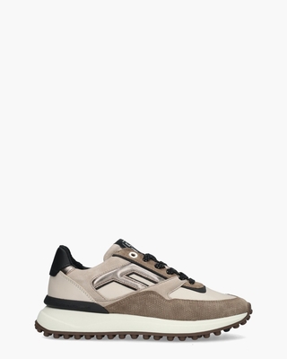 De Floris van Bommel Noppi 36.16/SFW-10128-34-02 damessneaker combineert diverse kleuren – van beige en taupe tot zwart en roségoud – in een gelaagd ontwerp van suède, leer en geprint suède. De metallic oversized F aan de zijkant geeft het model een coole look. Het uitneembare voetbed en de lederen voering bieden draagcomfort, terwijl de EVA-zool met contrasterende noppen en zwarte logo-stabilizer grip en stabiliteit garandeert. Details als gouden logo-eyelets, tweekleurige zwarte en gouden veters en FVB-branding maken het design in een normale G-leest compleet. Ga voor een sportieve uitstraling met een wide leg pantalon en een cropped sweater in neutrale tinten. Kleur: multi. (Taupe) Schoenen van Floris van Bommel vallen over het algemeen iets ruimer uit.