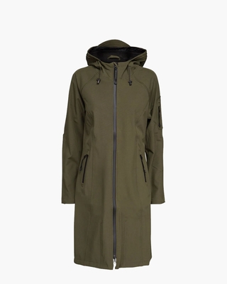 Regenjas Softshell RAIN37-410 uit de collectie van het Deense label Ilse Jacobsen. Deze waterdichte legergroene regenjas valt net onder de knie en heeft een zachte fleecevoering en een waterdichte 2-way rits die zowel van de boven- als onderkant opengemaakt kan worden. De jas is voorzien van een capuchon met trekkoord, twee ritszakken op het voorp&, twee ritsen aan de onderkant van de mouwen en een rits en merklogo op de bovenarm. De lengte van de jas is 85 cm in maat 36. Samenstelling: 94% polyester, 6% elastaan. Voering: 100% polyester fleece. Kleur: legergroen. (Army) Onderhoud: • Behandelen met speciaal wasmiddel om de waterafstotende eigenschappen te behouden.