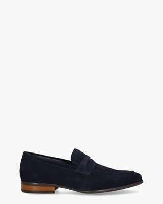 Klassieke loafers voor heren model Reso uit de collectie van Daniel Kenneth. Deze herenschoen heeft een bovenwerk van zacht suède in een donkerblauwe tint. De pennyband en de stiksels geven de schoenen een geklede look. De binnenkant is van leer gemaakt en is voorzien van een vast voetbed. De hiel is verstevigd en dankzij de rubberen zool lopen de instappers supercomfortabel. Kleur: donkerblauw. (Navy)
