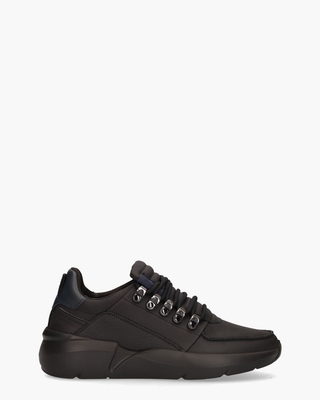 Zwarte sneakers voor heren Roque Roman 21057500-1018 van het merk NUBIKK. Dit model heeft een bovenwerk van glad en gestructureerd leer. De hielcap is in donkerblauw leer uitgevoerd. De zwarte/zilveren eyelets, de gewatteerde tong en de gestikte afwerking zijn opvallende details. De binnenzijde is ook van leer gemaakt en voorzien van een comfortabel uitneembaar voetbed. Branding op de tong en een zwarte linnen hieltag geven de trainers de kenmerkende NUBIKK-look. Een zwarte blown-up lichtgewicht 5 cm EVA-zool en zwarte ronde nylon veters stylen de handmade shoes af. Kleur: zwart. (Black)
