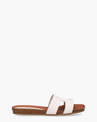 Slippers voor dames met de naam Rosy, van het merk Cypres. Deze slides zijn vervaardigd met een bovenwerk van wit glad leer, voorzien van een verfijnd cut-out patroon. De binnenkant is bekleed met stof, terwijl het licht voorgevormde, comfortabele voetbed van kurk met leer is omhuld. De onderzool is gemaakt van rubber voor duurzaamheid en optimale grip. Kleur: wit. (Blanco)