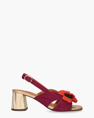Sandalen voor dames Rutina van het merk Chie Mihara. Dit model heeft een upper van roze suède met een suède bloemapplicatie in rood en zwart op de wreef. De binnenkant en het voetbed zijn gemaakt van zacht leder. Met het gespje bij de enkel kun je de bandjes verstellen. De blokhak is 5 cm hoog en is bewerkt met een witte/gouden print. De metallic gouden afwerking rond de zool en aan de voorkant maakt de sandalen compleet. Op de rubberen zool loop je tot slot comfortabel. Kleur: multi. (Multicolor)
