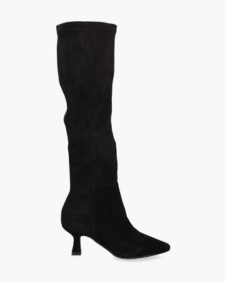 Lange laarzen voor dames Sharida 30045-PR29 uit de collectie van het merk Di Lauro. Dit model op een spitse leest heeft een upper van zwart soepel, licht elastisch suède. De binnenkant is in stof met een vast voetbed uitgevoerd. De schacht heeft een hoogte van ongeveer 44 cm. De laarzen hebben een korte ritssluiting onderaan. De met suède beklede queeniehak is 7 cm hoog. De zool is van rubber gemaakt. Kleur: zwart. (Black)
