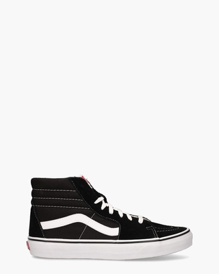 Sneaker voor heren, geà nspireerd op de ' Classic Oldskool' van het label Vans. Deze hi-top herensneaker <i> Sk 8-Hi VN000D5IB8C</i> heeft een upper en binnenwerk van stevig canvas. De iconische Vans 'side stripe' is in suède uitgevoerd. De tong en de schacht van de schoen zijn gemaakt van padded materiaal en de witte rubberen cupzool is aan de achterkant voorzien van het Vans-logootje. Op de tong is ook branding zichtbaar. Kleur: zwart/wit. (Black/ White)