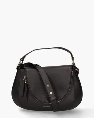 Schoudertas Sole Medium uit de collectie van Coccinelle. Een stijlvolle zwarte leren tas met een sluiting onder de flap door middel van een magneetje. Dit veelzijdige accessoire heeft een voorvak afgesloten met een rits. Binnenin is er een stoffen voering met een interne roze leren tag en een binnenvak met ritssluiting. Deze tas kan zowel als handtas als schoudertas gedragen worden, dankzij de bijgeleverde schouderriem. Charmante leren flosjes hangen aan de ritsen, terwijl het gouden merklogo en andere gouden details deze tas compleet maken. Afmetingen: hoogte 22 cm, breedte 30 cm, diepte 9 cm. Kleur: zwart.