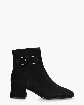 Enkelboots voor dames Suna uit de collectie van het merk Di Lauro. Dit model op een carréleest heeft een bovenzijde van zwart suède. De binnenkant is van leer met een vast voetbed gemaakt. De schacht met een hoogte van circa 13 cm is aan de zijkant voorzien van een zwarte gesp. De stevige blokhak is ook met zwart suède bekleed en meet ongeveer 5, 5 cm. De laarsjes sluiten met een rits opzij. Kleur: zwart. (Black)