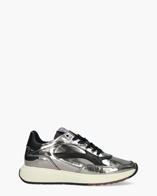 Deze damessneakers Suvi 02.08/SFW-10138-90-01 uit de Premium collectie van Floris Van Bommel stralen luxe uit. Dit handgemaakte model is uitgevoerd in glad gepolished metallic zilver leer afgewerkt met zwarte leren en printleren accenten. De lederen binnenkant, voorzien van een extra dik uitneembaar voetbed, zorgt voor optimaal comfort. De gebroken witte rubberen zool met zwarte en bruine gekartelde onderzool biedt een comfortabele stap. Branding op de tong en hiel versterken de kenmerkende Floris-look. Zwarte katoenen veters en zilveren logo-eyelets ronden deze sneakers, met een normale G-leest, elegant af. Kleur: zilver/zwart. (Silver) Floris Van Bommel schoenen vallen doorgaans iets ruimer uit.
