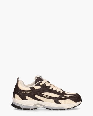 Sneakers voor heren The Re-Run Pineapple uit de collectie van het Amsterdamse label Mercer. Deze runners in 90's stijl hebben een upper van donkerbruin veganistisch materiaal in lederlook en ecrukleurig gerecycled mesh. Gouden accenten maken de shoes extra flashy. De binnenkant is in gerecycled polyester uitgevoerd en voorzien van een uitneembaar voetbed. De multicolor zool is van rubber gemaakt. Branding op de zijkant van de schoen en op de tong en ecru katoenen veters maken de ultralichte sneaks af. Kleur: donkerbruin/ecru. (Dark Brown) ...