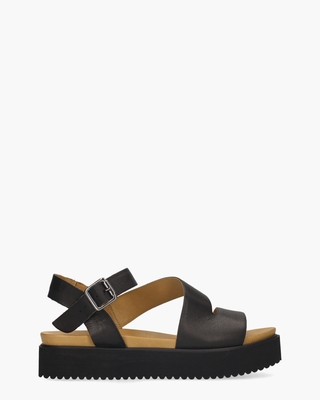 De Thera sandaal van Cypres geeft je zomergarderobe nét dat beetje extra. Het zwarte leren bovenwerk is makkelijk te combineren met allerlei outfits. De diagonale banden omsluiten je voet op een elegante manier, terwijl het zachte voetbed en de imitatielederen voering bijdragen aan een comfortabel gevoel. Het hielbandje verstel je makkelijk met het gespje. De witte rubberen zool met grof profiel voegt een sportief accent toe en geeft je 5 cm extra hoogte. Kleur: zwart. (Black)