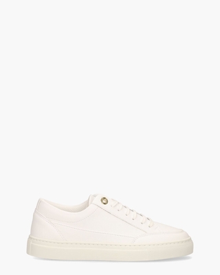 De witte sneakers Tia 19A voor dames van Mason Garments stralen pure luxe en stijl uit. Het bovenwerk, gemaakt van zacht leer, geeft deze sneakers een verfijnde look. De binnenkant, uitgevoerd in ademend mesh, biedt zowel comfort als ondersteuning dankzij het uitneembare voetbed. De opvallende gouden eyelets en logo's trekken direct de aandacht en versterken de luxe uitstraling. De witte rubberen zool, met een hoogte van circa 3 cm, en de gestikte accenten zorgen voor een stijlvolle finishing touch. Kleur: wit. (White) ...