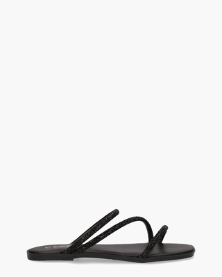 Slippers voor dames Tizia I uit de collectie van Cypres. Dit model heeft een bovenwerk van leer voorzien van zwarte glinsterende steentjes. De dunne bandjes lopen diagonaal over de wreef. De binnenkant en het voetbed zijn ook in leer uitgevoerd. Het lage hakje is circa 1 cm hoog. De zool is van rubber gemaakt. Kleur: zwart. (Nero)