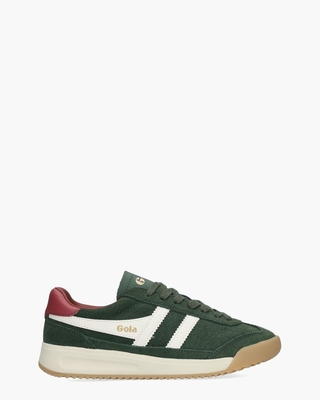 Vintage 80's sportstijl in een eigentijds jasje. Deze Gola Tornado 88 hebben een upper van donkergroen suède en off-white kunstleer. De goudkleurige merklogo’s en roze hielcap geven dit model extra karakter. Dankzij de leren en stoffen voering en het uitneembare voetbed geniet je van optimaal comfort. De rubberen profielzool zorgt voor grip en stabiliteit, terwijl de gekartelde details en de bijpassende groene veters de retrolook compleet maken. Draag ze met een rechte jeans en een oversized blazer voor een stijlvolle streetstyle. Kleur: donkergroen. (Evergreen/ Off-White/ Cerise)